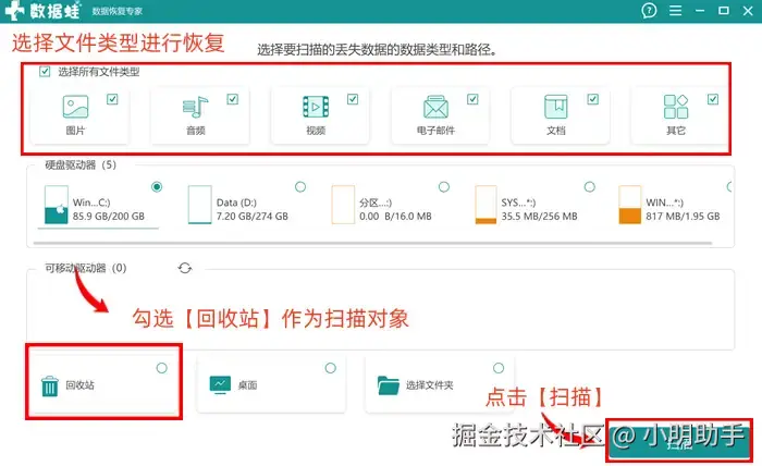 操作1: 打开软件我们直接进入扫描准备页面,可以直接勾选【选择所有文件类型】和【回收站】,点击按钮直接开启接下来的【扫描】。