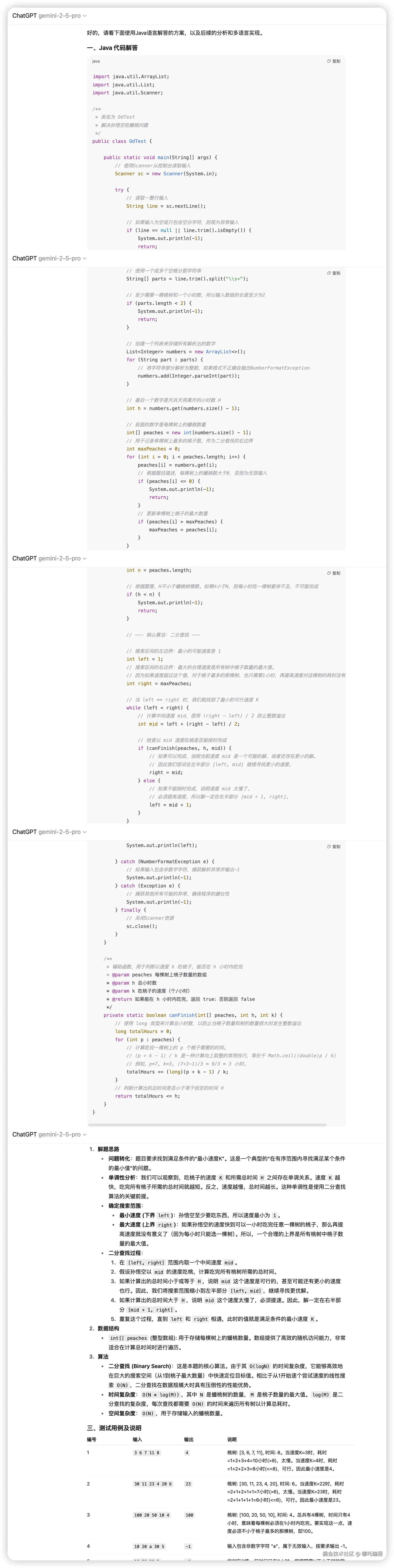 Gemini 2.5 Pro给出了详细的Java 代码、详细的代码注释、解题思路与算法分析(包含解题思路、采用的数据结构和算法、复杂度分析)、测试用例及说明(不包含边界用例)、其他编程语言代码。