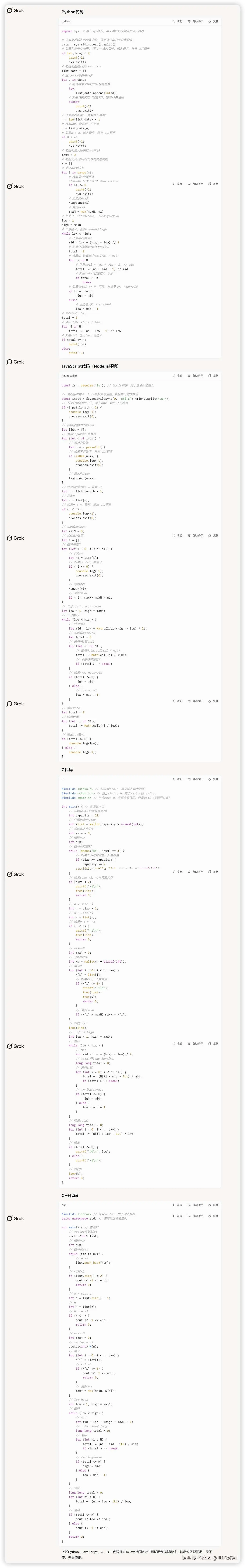 Grok4给出了详细的Java 代码、详细的代码注释、解题思路与算法分析(包含解题思路、采用的数据结构和算法)、测试用例及说明(不包含边界用例)、其他编程语言代码。