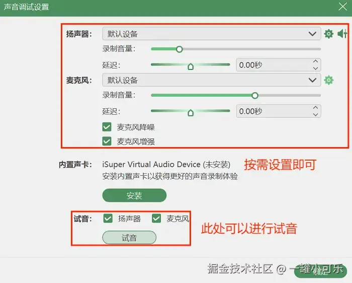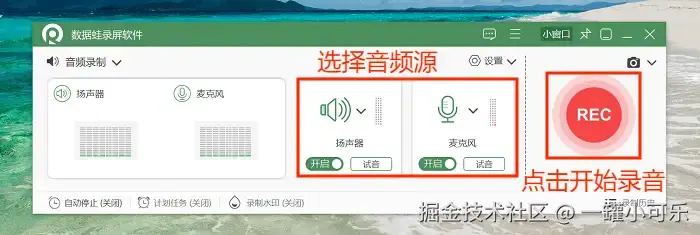步骤2:选择需要录制的音频源,如果需要录制外部声音,就开启麦克风录制;需要录制内部的声音,就开启扬声器录制。也可以两个同时开启。而且我们还可以在 “声音调试设置” 中调整参数,比如录制的音量、延迟,还可以开启麦克分降噪等。设置完毕后点击 “REC” 开始录音。