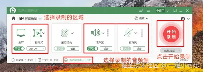 第2步:选定录制模式后,需要对录制参数进行设置。在声音来源方面可以灵活选择:如果只需记录软件操作时的音效,就只勾选录制系统声音;如果要进行讲解旁白,开启麦克风声音即可。要是想给录制的视频添加水印,点击开启 “图片水印” 功能并进行相关设置就行。待所有参数都设置妥当,点击 “开始录制” 按钮,录屏工作就会正式启动啦!