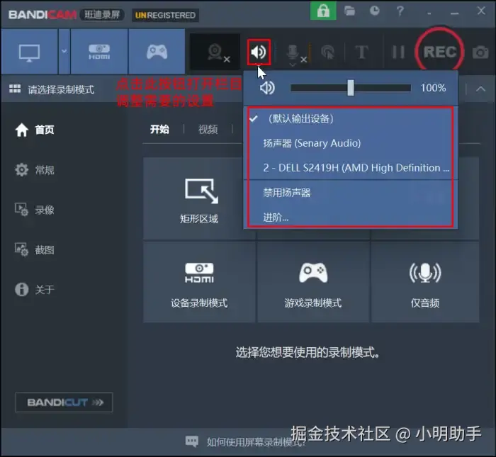 Bandicam同样可以解决录屏怎么把声音录进去这一问题,操作也并不难,只需要在Bandicam的界面上方工具栏中选择设置扬声器进行调整设置即可。