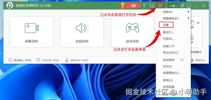 步骤①:启动数据 蛙录屏软件,在主界面中找到并打开设置界面。
