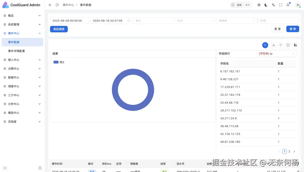 举场景例子,在多个条件组合下查看某个人用过哪些设备、ip、ip省份,等等;当然这些拆分出来在分析中心下的排名也能看到,但在这里可以直接查看具体事件的详细数据,毕竟列表还在下面躺着呢。