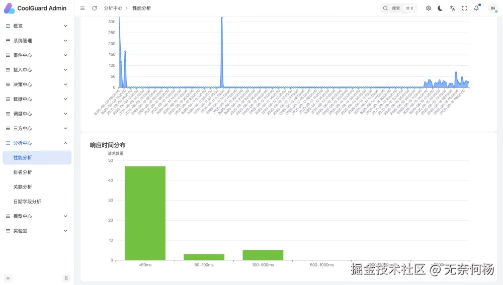 如下,性能分析,检索条件和事件数据一致,展示的是条件下的平均耗时、最大耗时、最小耗时、按时间的1小时内的平均耗时折线图、响应耗时分布图。
