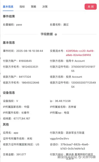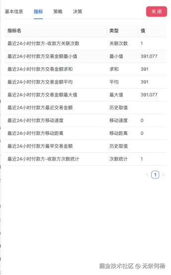 关于详情,点击任意一行就展示事件的详细数据,包含基本信息、指标、策略、决策运行耗时等。