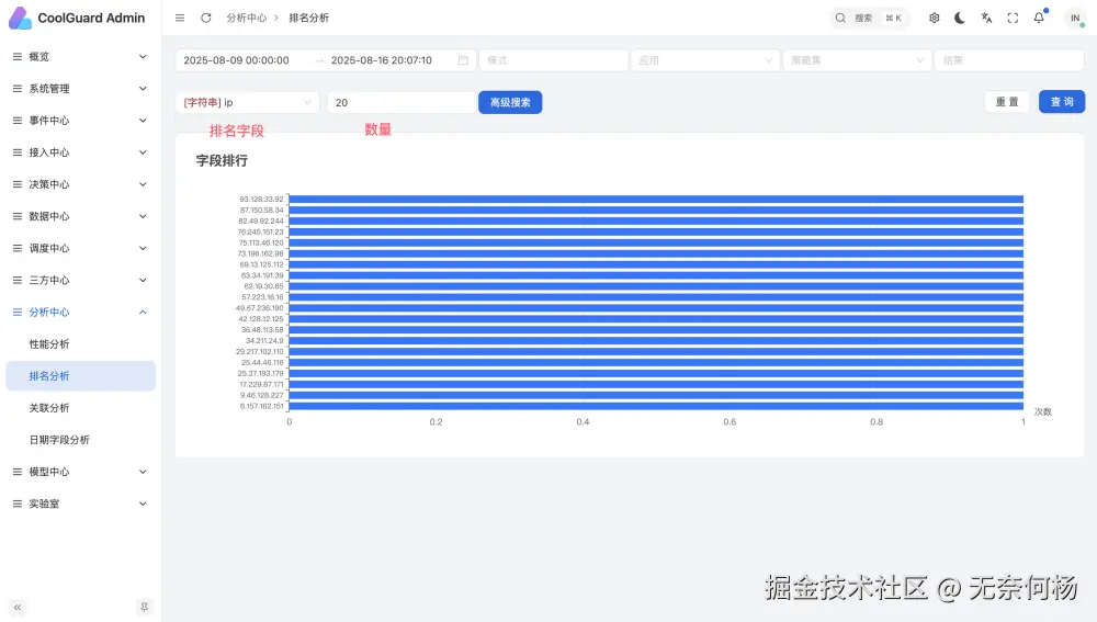 关于字段排行可以用于分析各种条件的IP、设备指纹、等等数据,可以看某个省份的哪个客户交易最多等等