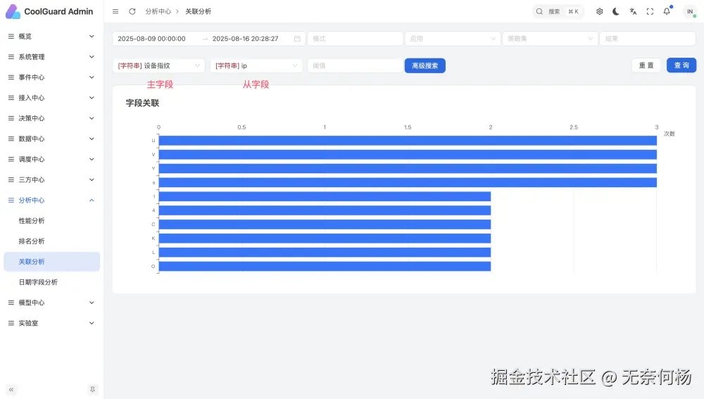 关联分析,相比于普通条件增加了主字段、从字段和阈值的条件,就是查询主字段关联的从字段在不小于阈值的关联排行,可以做什么?也很清晰,在条件下查看哪些设备关联的ip最多?哪个省份的手机号最多?等等