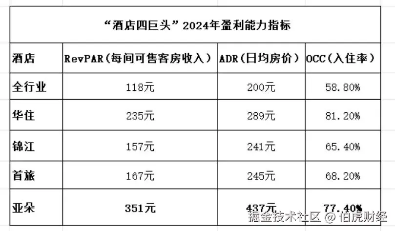 根据酒店之家数据,2024年全行业的ADR(日均房价)为200元。而四大酒店的日均房价分别为:亚朵为437元、首旅为245元、华住为289元、锦江为241元。