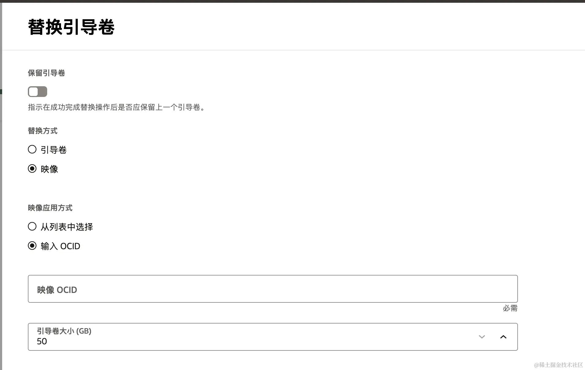 无需开启 “保留引导卷开关”,选择 “映像” 和 “输入 OCID” 选项