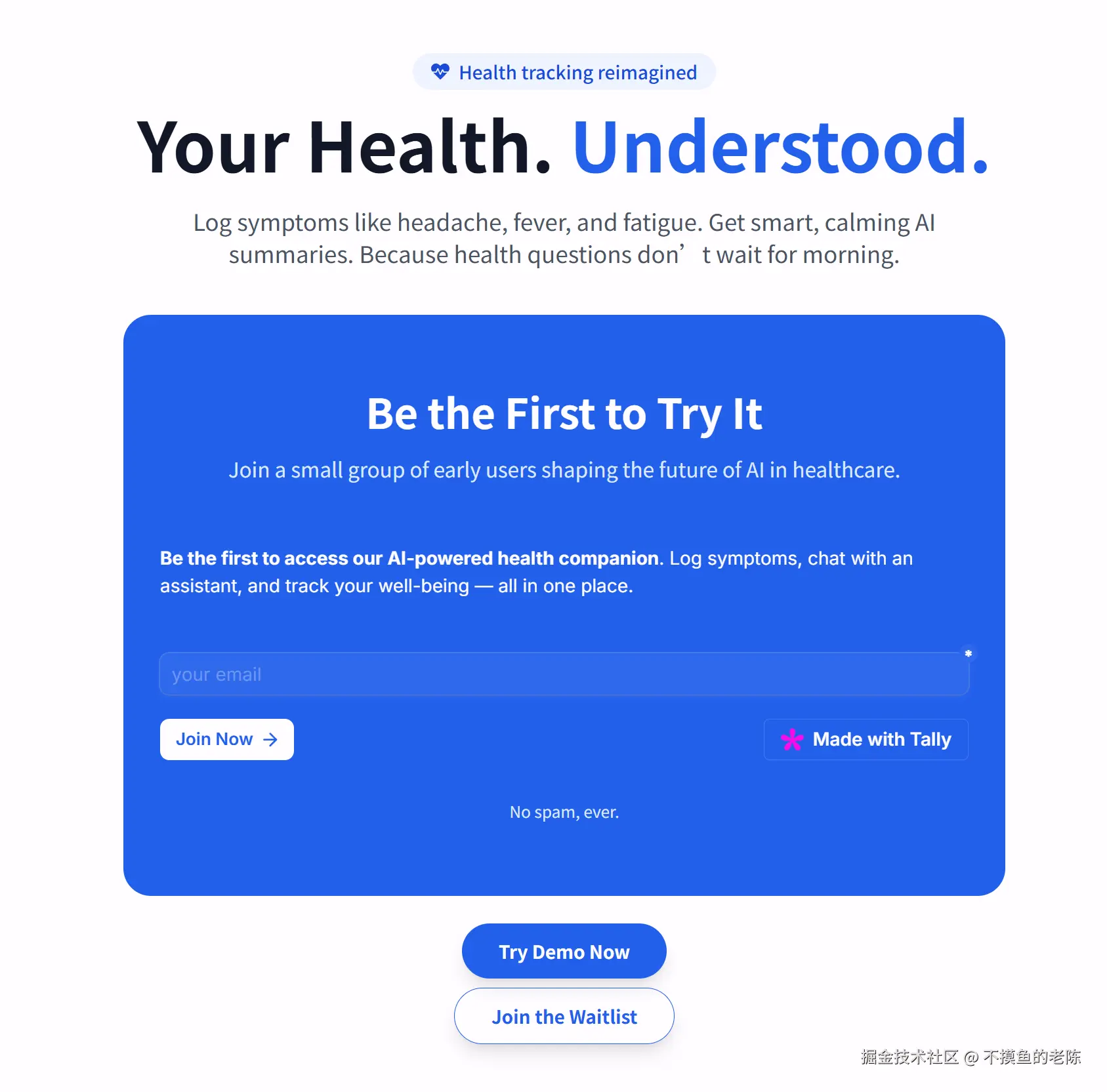 clear-vitals是一款AI工具,用户描述症状后,AI能够生成给医生的总结,当前仍在早期开发阶段。