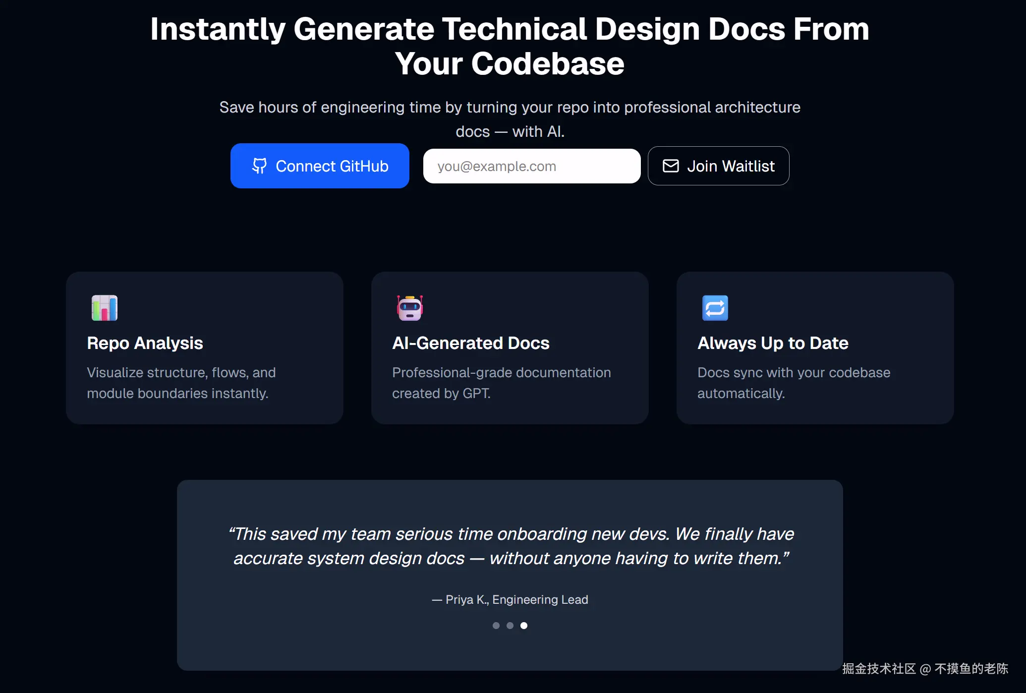 Archscribe是一款AI驱动的工具,能够从代码库生成技术设计文档,帮助开发者节省编写文档的时间。