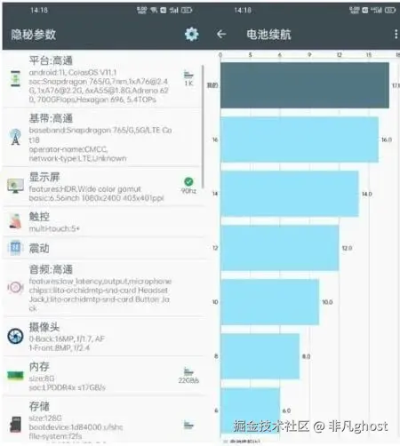 摄像头参数:查看前后摄像头的像素、光圈、焦距等详细信息。