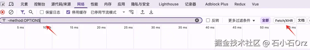 -method:OPTIONS来过滤掉 OPTIONS 请求,只看其他请求; - 或直接点击 Fetch/XHR 按钮,快速隐藏无关请求。