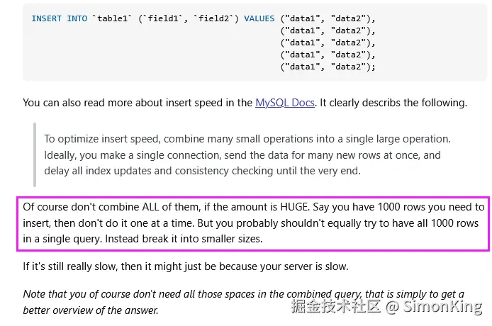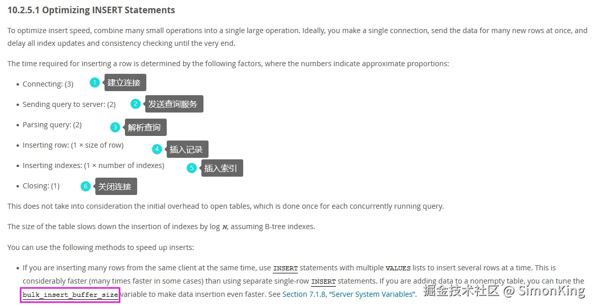 上面的这种写法确实比一条条的数据入库的速度快太多,我们这里只横向对比不同的批量插入。我们先看看Mysql官方给的Insert执行的流程。