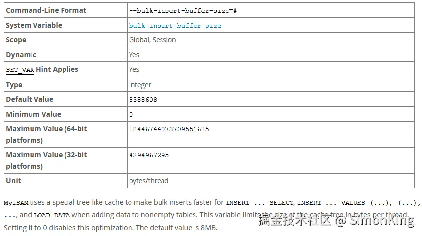 Myisam引擎参数,在使用myisam引擎执行INSERT ... SELECT,INSERT ... VALUES (...), (...), ...,LOAD DATA INFILE批量插入时,会采用一种缓存树的内存结构来优化插入速度。默认8M。
