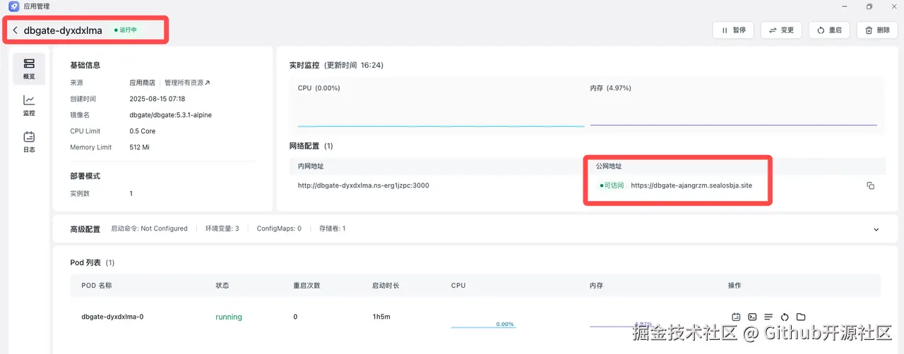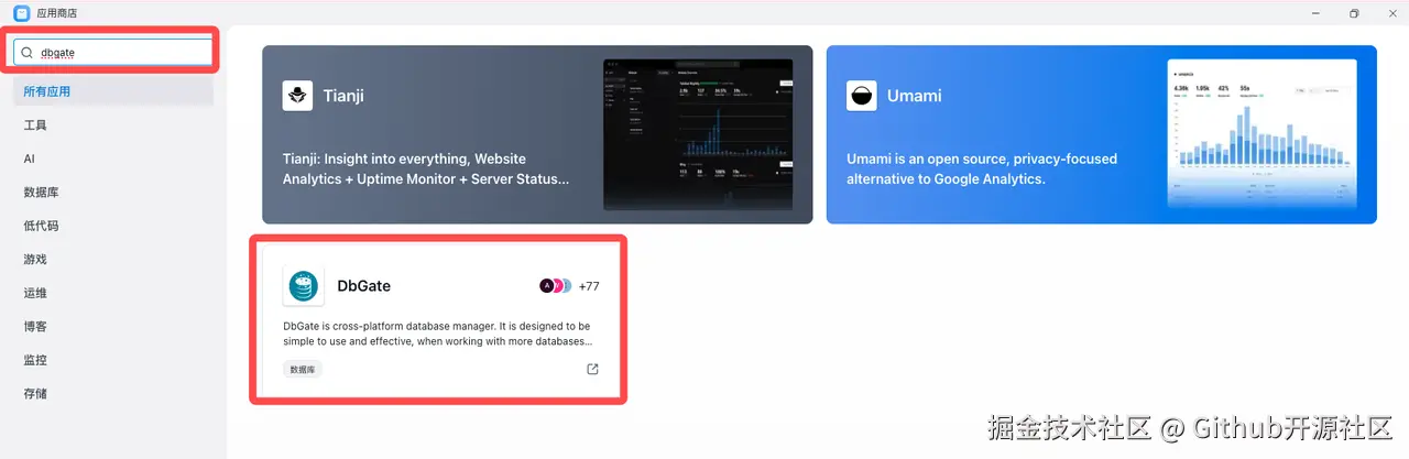 - 在 「应用商店」 里,找到你刚刚安装好的 DbGate,点击它的公网 地址。