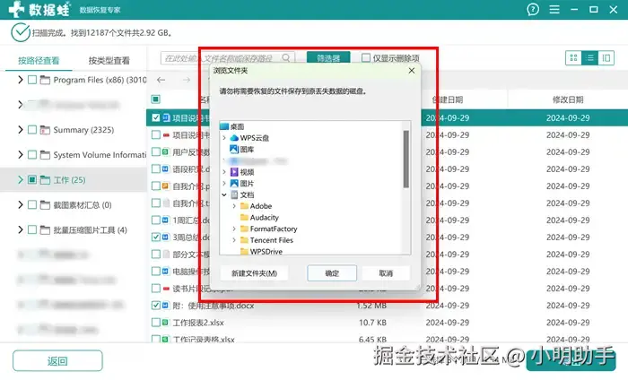 步骤3: 选中文件后按下【导出】按钮,之后在弹窗中选择恢复文件的存放位置。