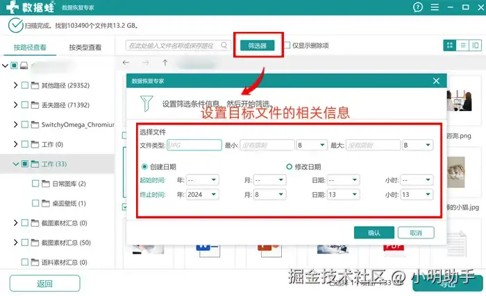 步骤2: 等待软件完成扫描后,可以选择文件进行导出恢复;如果因为扫描的文件太多而找不到目标文件,试着使用【筛选器】吧!在上面输入目标文件的相关信息,就能帮助用户排除筛选无关文件了;