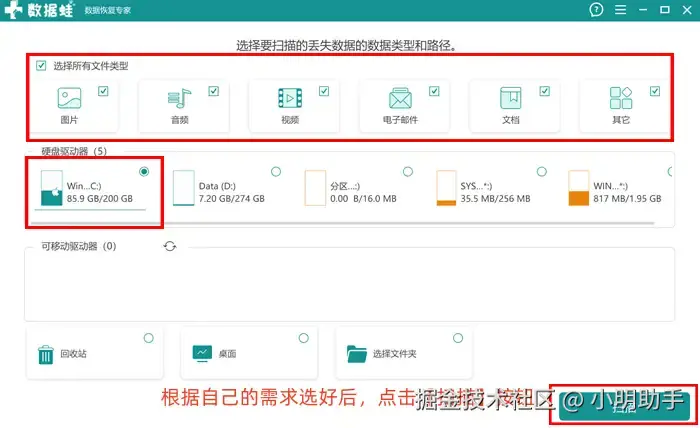 步骤1: 在软件的首页上勾选C盘和自己目标数据的类型,按下【扫描】按钮;