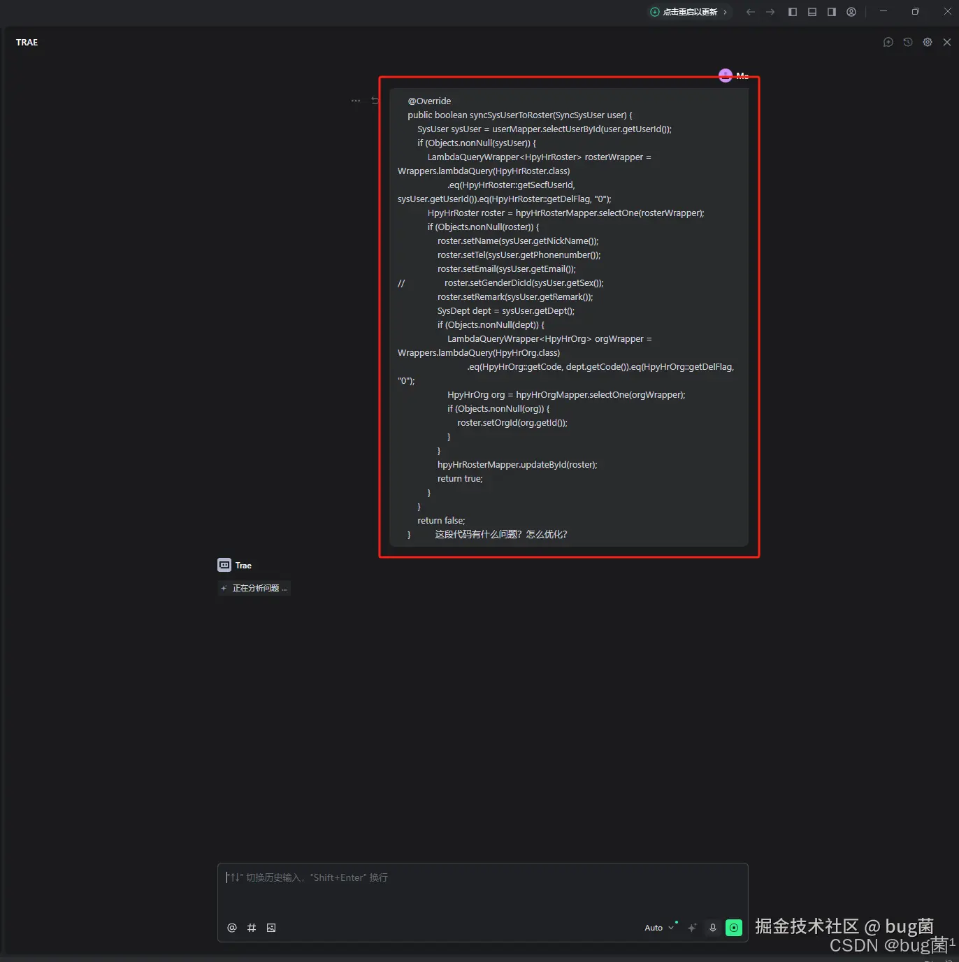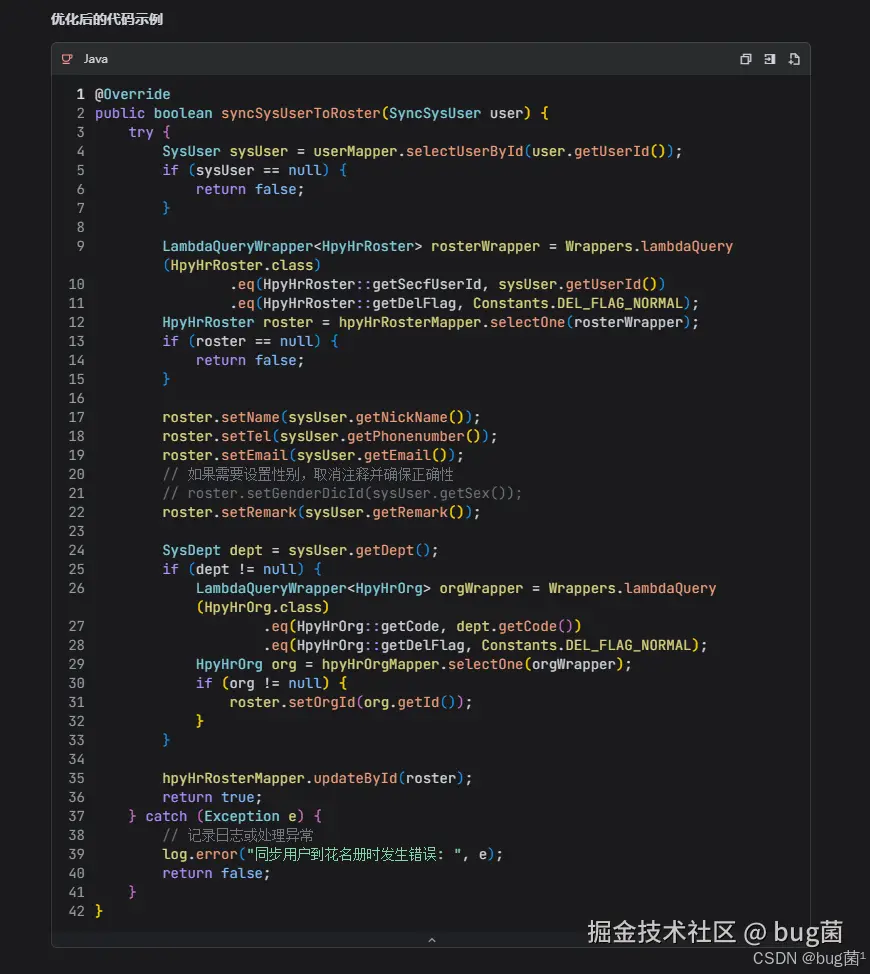 Trae:这段代码的主要功能是将系统用户信息同步到花名册中。虽然基本逻辑是正确的,但存在一些可以优化的地方: