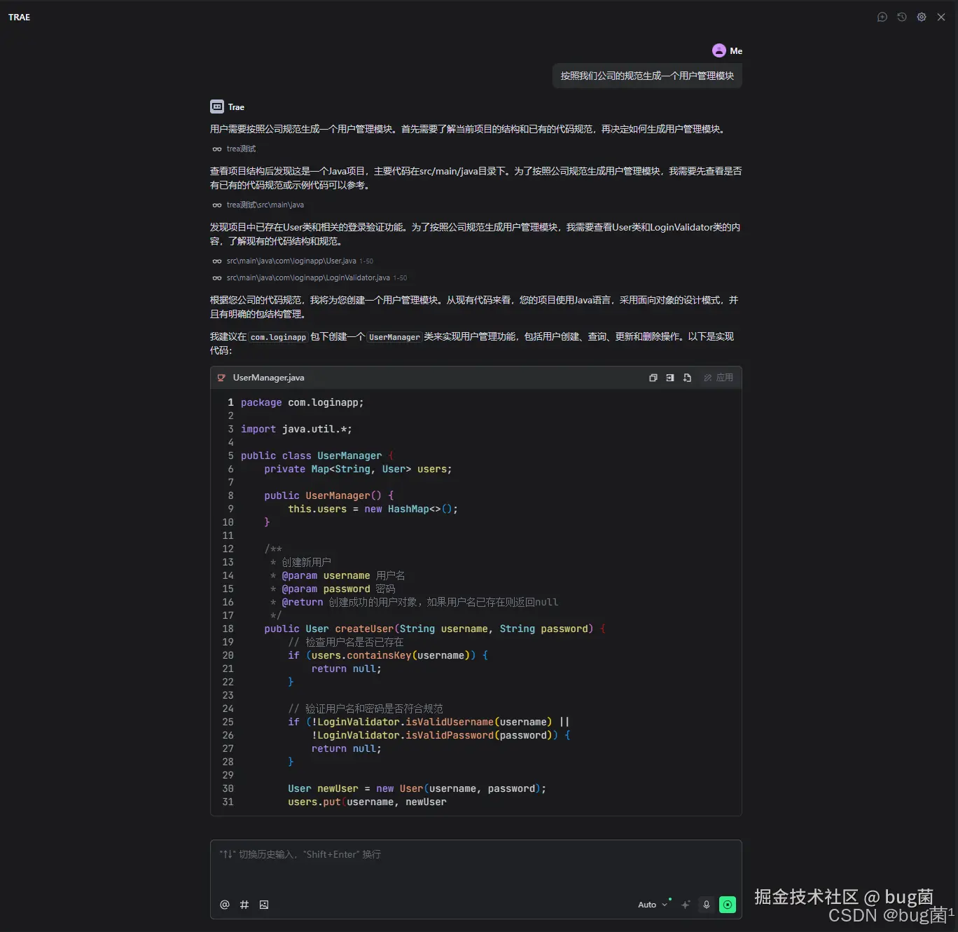 Trae支持根据团队的编码规范自动生成代码。比如,当我们告诉它"按照我们公司的规范生成一个用户管理模块"时,它会自动生成符合团队风格的代码: