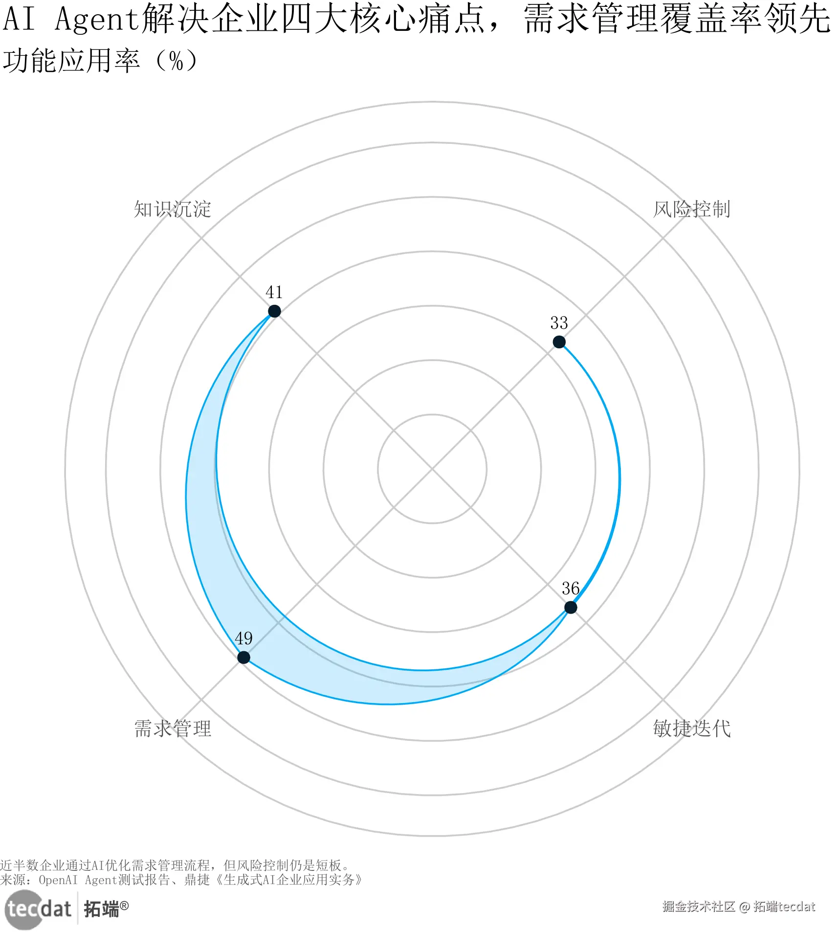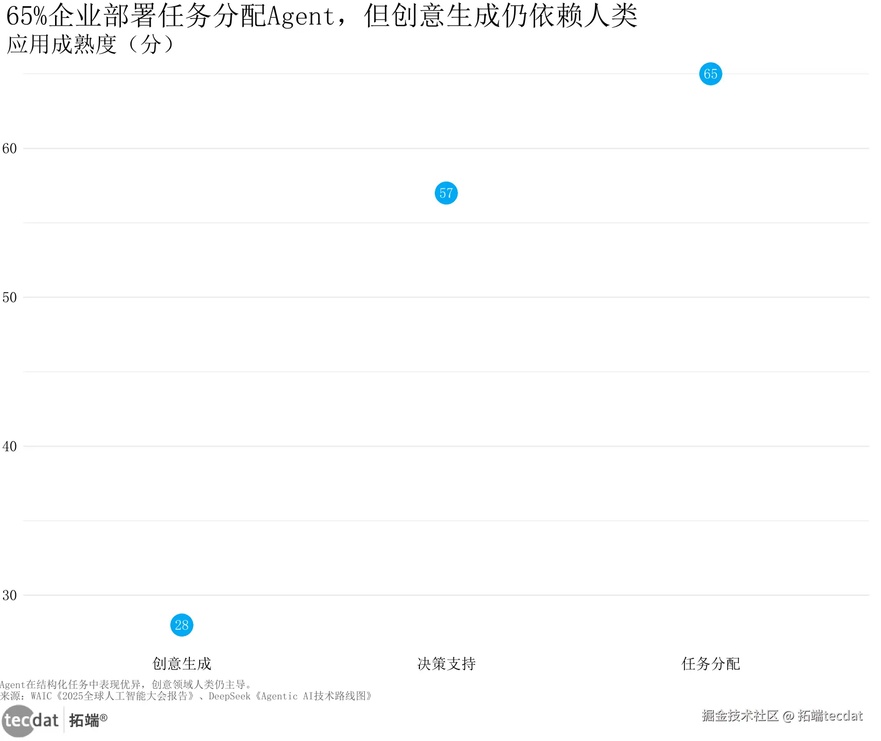 AI和人类在企业里早已有了明确分工。从应用成熟度看(见图1),任务分配场景中AI Agent的得分能到57分,考勤统计、订单派发这些活儿,它比人快3倍还少出错;但创意生成只有28分,某快消公司让AI写了100条广告语,最后能用的3条都经过营销总监改了又改。