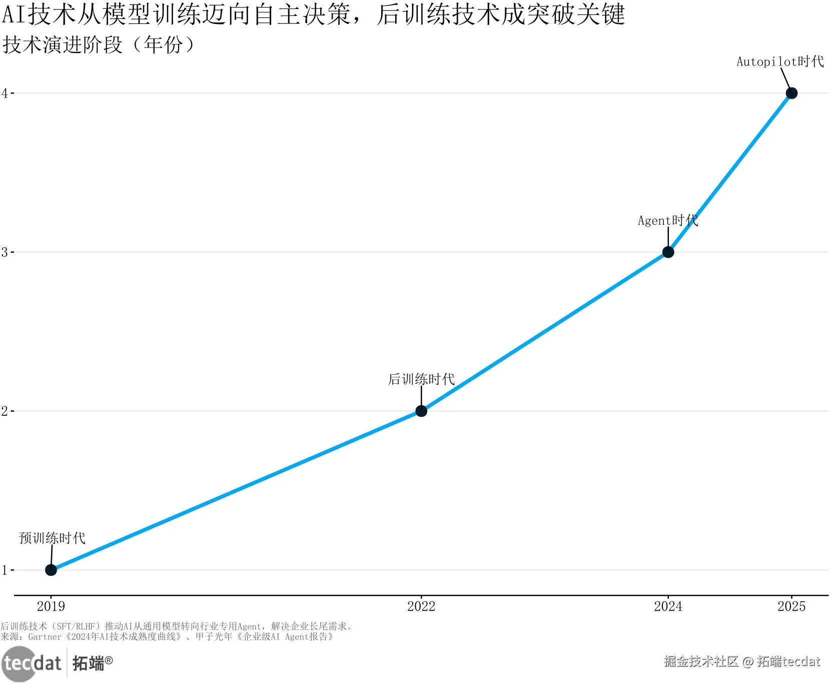 再看技术演进(见图4),AI这几年进步明显:2019年还在“死记硬背”的预训练时代,2022年靠SFT/RLHF技术懂了“人情世故”,2024年能自己拆任务,2025年眼看要学会自主决策。某物流企业的AI Agent现在能根据天气改路线,出错率比人调度低23%。