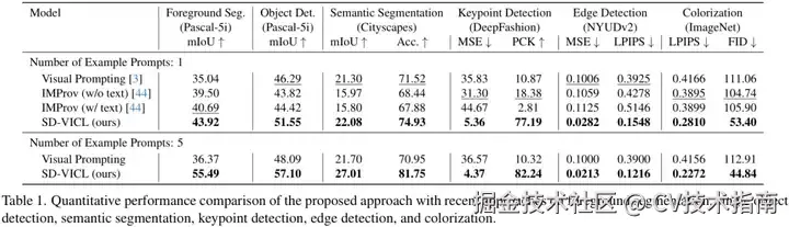 研究团队提出了一种创新的“就地注意力重新计算”方法,直接在Stable Diffusion的U-Net架构内部修改注意力机制,从而使其能够理解并执行基于少数几个示例(few-shot examples)的复杂视觉任务。实验结果惊人,该方法在前景分割、目标检测、边缘检测、上色等六种不同的视觉任务上都表现出色,在部分任务上的性能甚至超越了需要专门训练的现有方法。例如,在Pascal-5i数据集的前景分割任务上,其mIoU指标比Visual Prompting和IMProv等近期成果分别高出 8.9% 和 3.2% 。这一发现揭示了扩散模型尚未被充分挖掘的“涌现能力”,为计算机视觉领域的少样本学习开辟了新的道路。