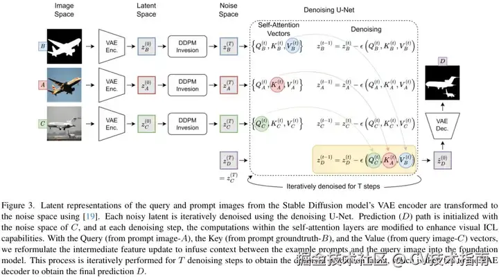 方法流程图:在去噪过程的每一步,通过修改自注意力层的计算,将示例提示(A和B)中的上下文信息注入到查询图像(C)的处理过程中,最终生成预测结果(D)。