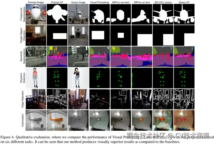 从可视化的结果来看,该方法生成的预测图在各种任务上都展现了很高的质量,其结果在视觉上通常优于需要专门训练的Visual Prompting和IMProv等基线模型。
