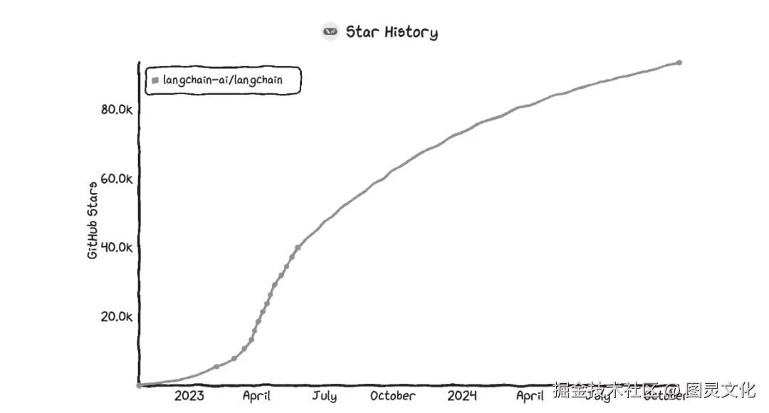 LangChain在GitHub上的star数变化趋势(数据截至2024 年10月)