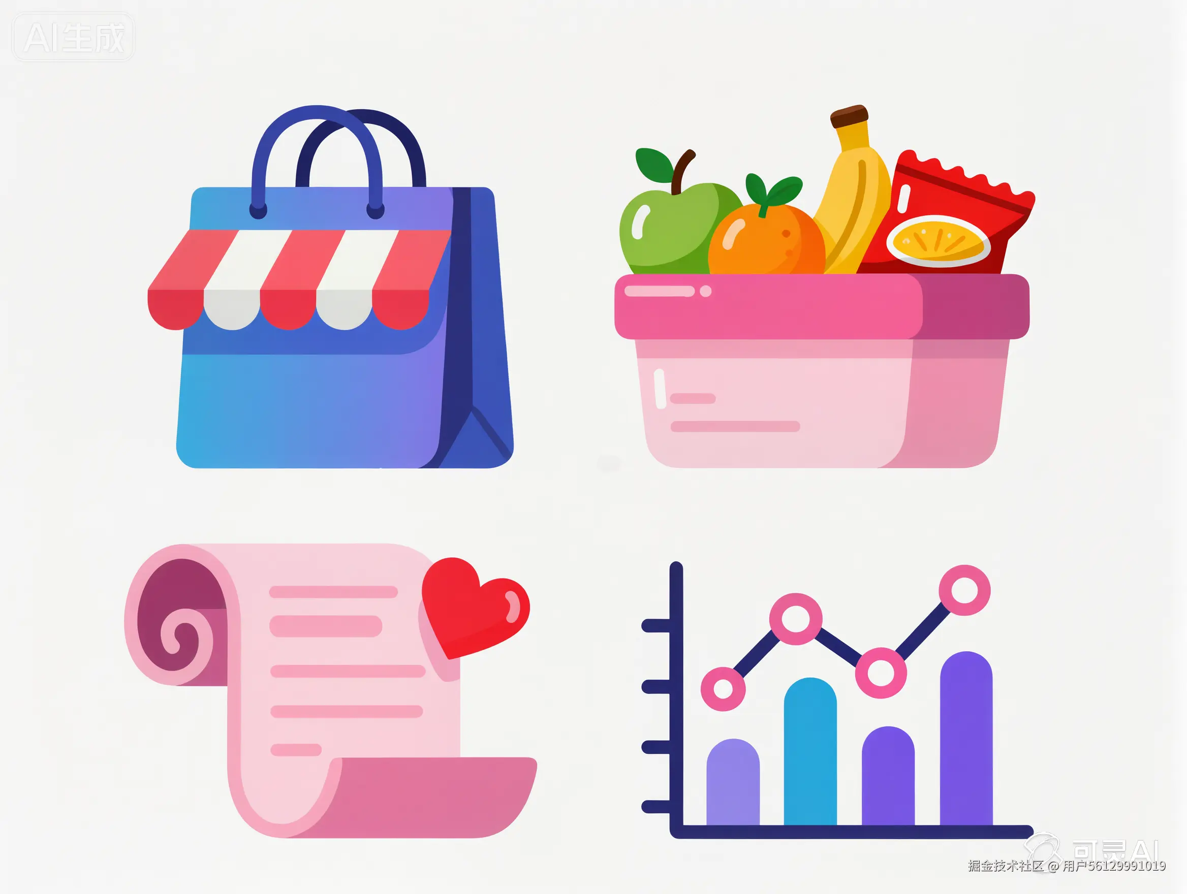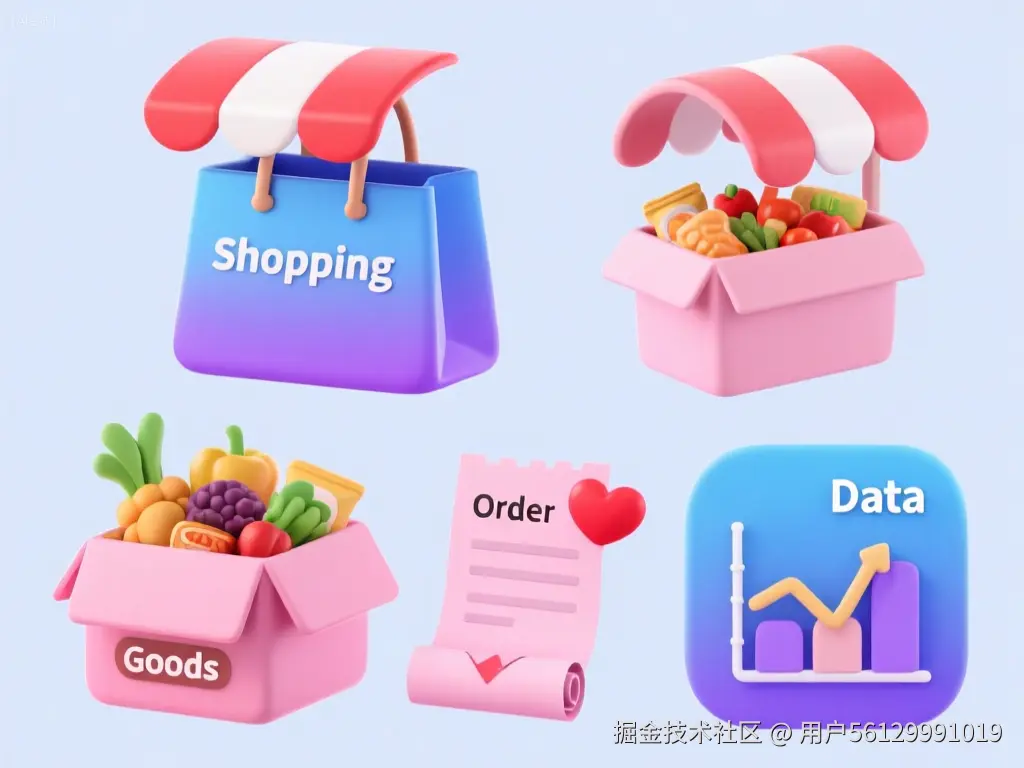 绘制一组适用于电商平台的图标,以明快的色彩和圆润的造型呈现。购物袋(Shopping)用蓝紫渐变搭配红白遮阳篷,装满果蔬零食的箱子(Goods)是粉色系,订单(Order)用粉色纸卷加红心点缀,数据(Data)以蓝紫配色的图表展现,风格清新时尚。