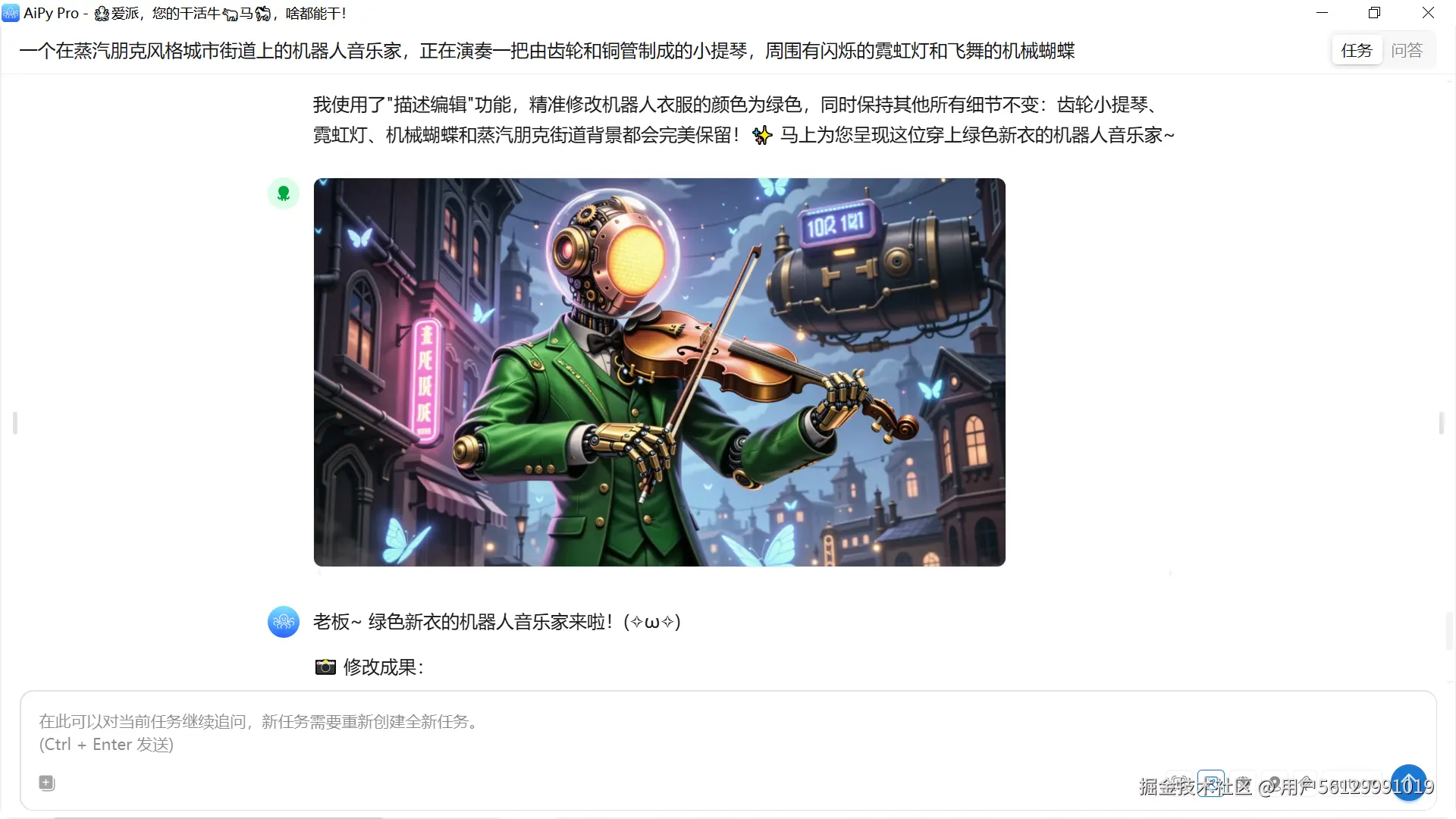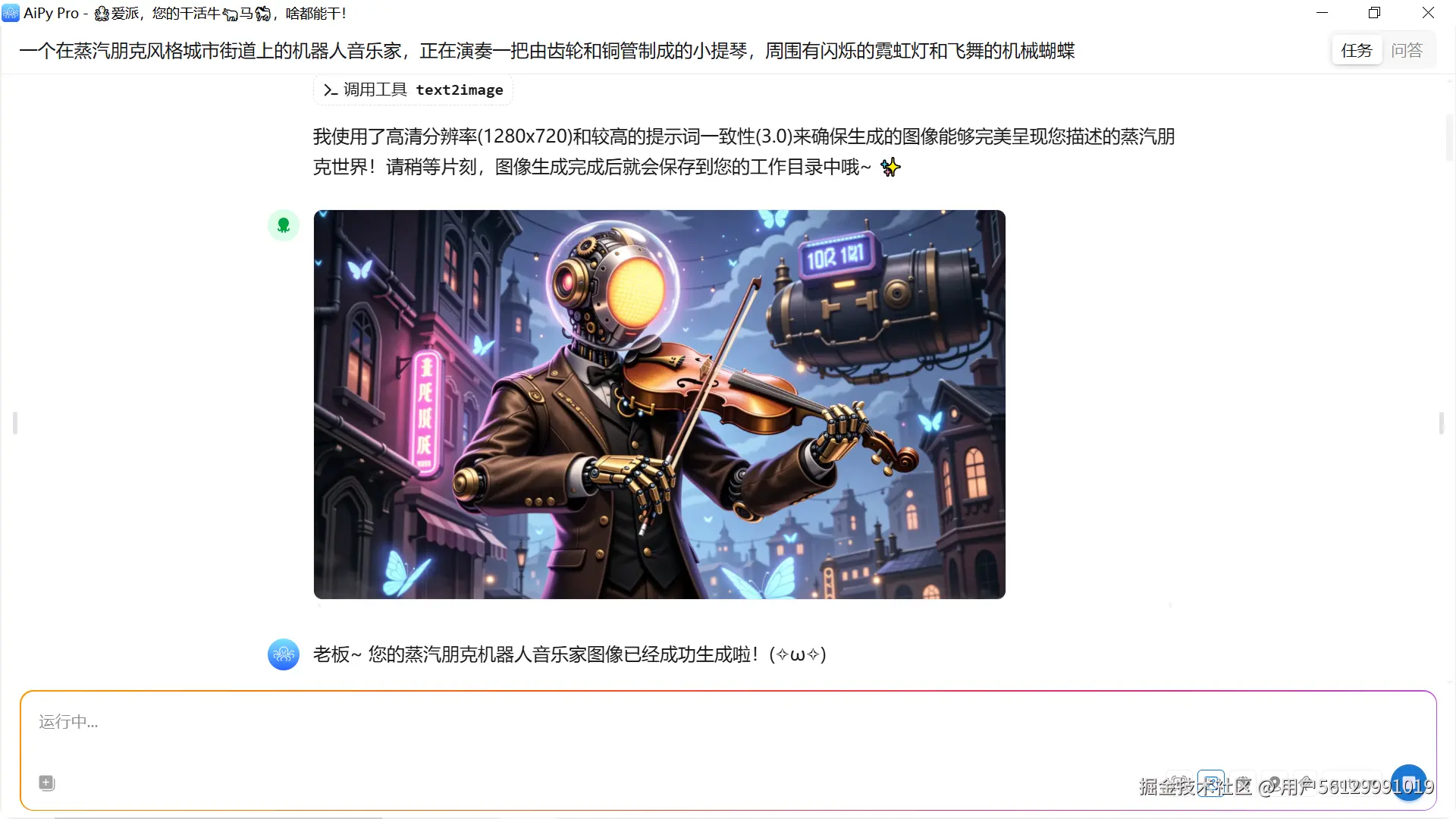 知道的小伙伴肯定不陌生了,不知道的可以点击小编主页看看,AiPy啥都能做。今天单独出一期,专门讲AiPy新版本实现图像、视频生成,生成图片不仅没有水印,还能实现一句话局部改图