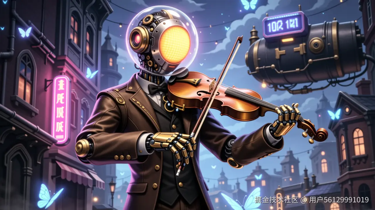 一个在蒸汽朋克风格城市街道上的机器人音乐家,正在演奏一把由齿轮和铜管制成的小提琴,周围有闪烁的霓虹灯和飞舞的机械蝴蝶