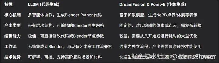 要理解LL3M的真正价值,我们必须将它与当前主流的3D生成模型进行对比。这些模型,如DreamFusion和Point-E,大多基于扩散模型或NeRF,其本质是通过对2D图像的扩散过程进行优化,最终生成3D表示(如点云或体素)。我们可以把这种方式理解为一种“像素流”的生成范式,而LL3M则开辟了全新的“代码流”路径。