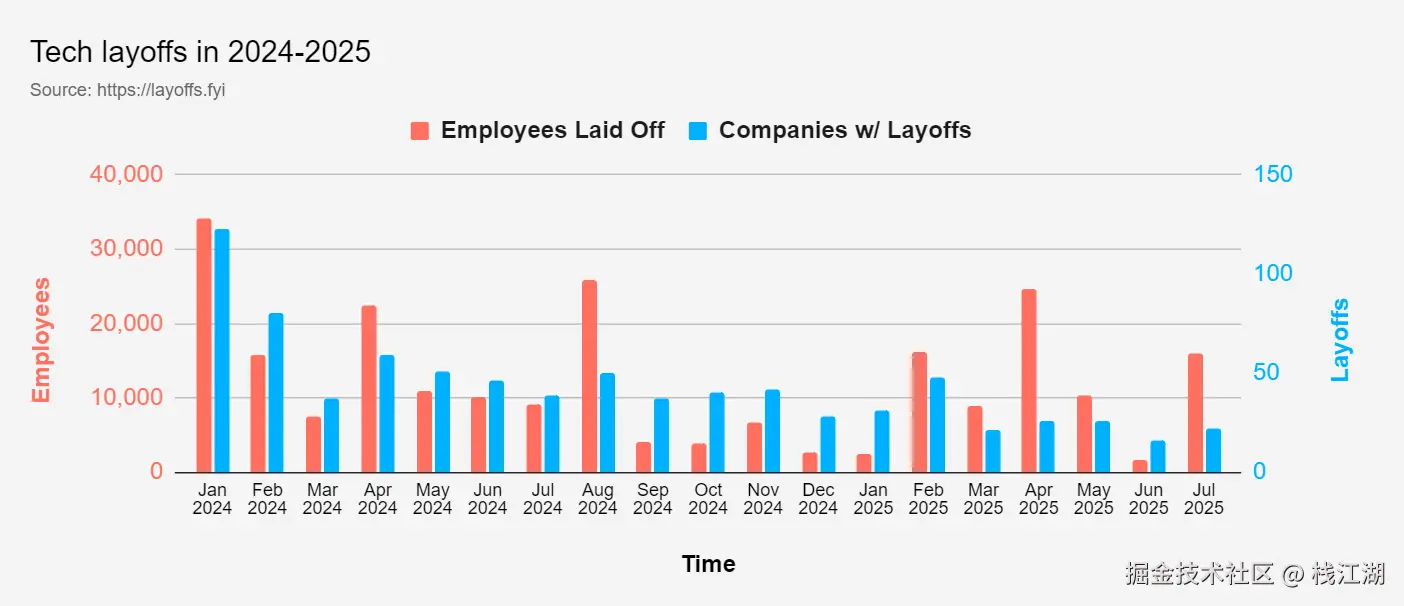 据统计2024年共有551家科技公司,裁员15.3万人,其中裁员最多的戴尔、英特尔、特斯拉合计解雇员工5.55万人。2025年上半年裁员数据差不多就有8.2万人,感觉情况也没有太大的好转趋势。