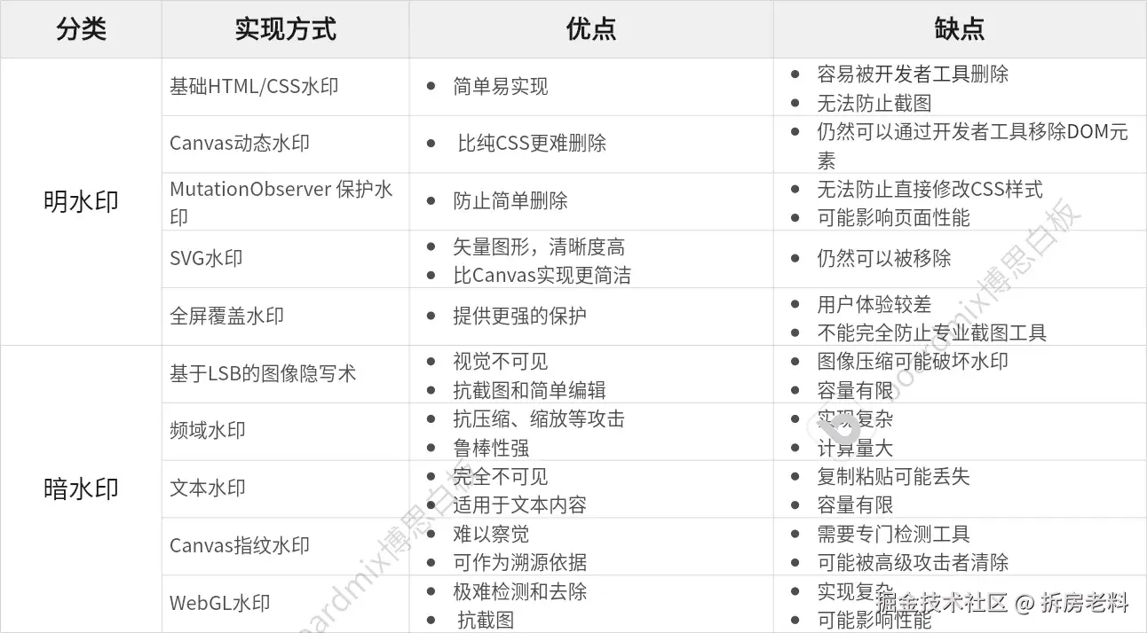 前两者需要做容器或水印内容的防删除或属性修改,保护水印层