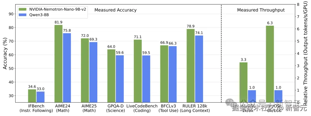 「【新智元导读】英伟达发布全新架构 9B 模型,以 Mamba-Transformer 混合架构实现推理吞吐量最高提升 6 倍,对标 Qwen3-8B 并在数学、代码、推理与长上下文任务中表现持平或更优。」