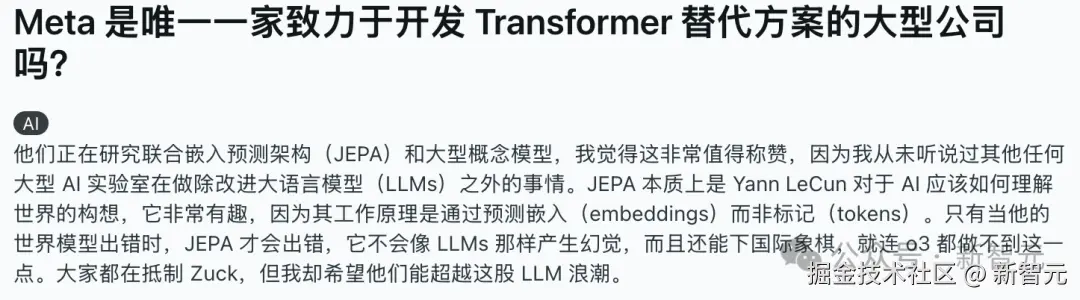 比如 Meta 公开推进 JEPA(联合嵌入预测架构)和大概念模型(LCMs)、状态空间模型(就是 Mamba)、记忆模型或扩散语言模型等。