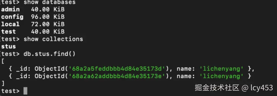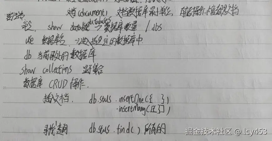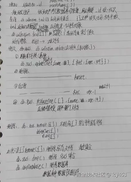 增删改查注意点,插入会自动添加-id作为唯一标识符,更新和删除都需要一个接收对象作为参数判断更新或者删除哪一个集合中的文档,查询返回的不是数组是一个游标对象,需要转化为数组才能用length方法去查看当前数据库中有多少集合