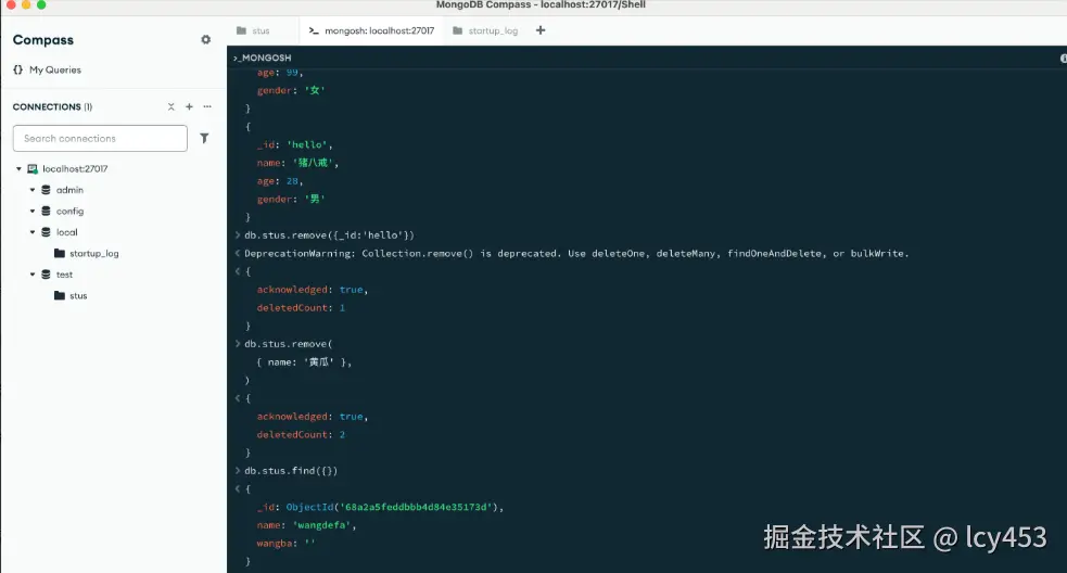 db.stus.remove({_id:'hello'})