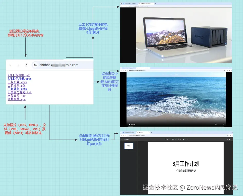 例:完成 ZeroNews 简易配置后,生成访问链接https://×××,点击可访问共享文件夹,支持照片(jpg、png)、文档(PDF、Word、PPT)、视频(MP4)等多种格式文件。