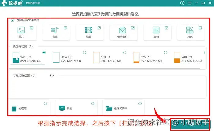 步骤1: 打开软件后进入首页,在该页面上根据指示在不同的板块中选择不同的扫描文件类型和扫描磁盘,点击【扫描】后让软件开始扫描工作。