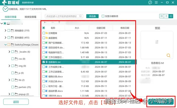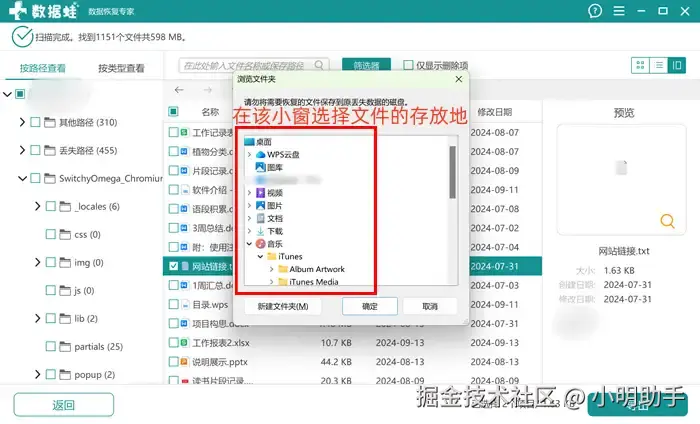 步骤2: 等待软件完成扫描工作后,我们可以在列表中选择文件进行导出,点击【导出】按钮。之后还会出现一个【浏览文件夹】弹窗,在上面选择存放的位置。