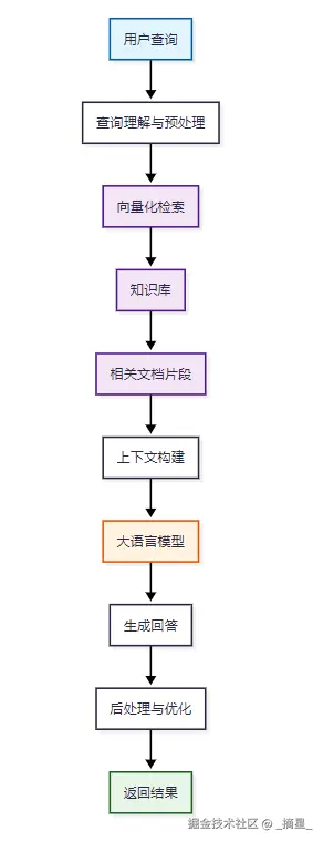 RAG(Retrieval-Augmented Generation)是一种结合了信息检索和文本生成的AI技术架构。它通过检索相关文档片段,然后将这些信息作为上下文输入到大语言模型中,生成更准确、更具针对性的回答。图1:RAG系统核心工作流程图