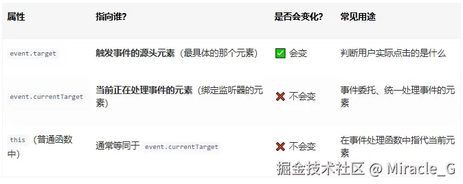 event.target→ 当你想知道用户实际点击或触发事件的元素是什么。 -