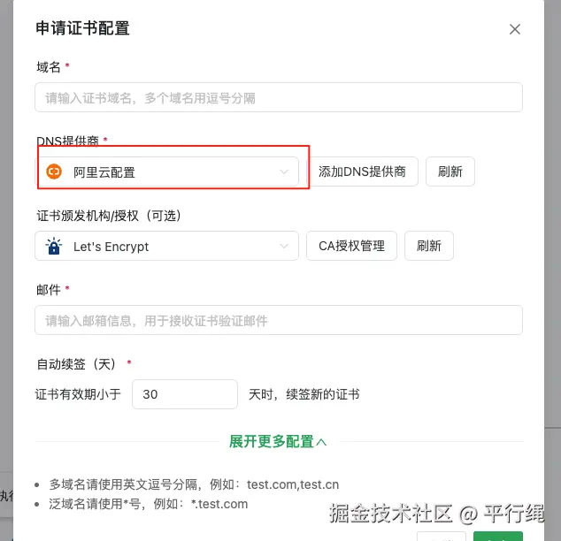 没问题之后就回到之前的申请证书配置的弹窗,这时候 DNS 提供商那里就有你刚才保存的了。