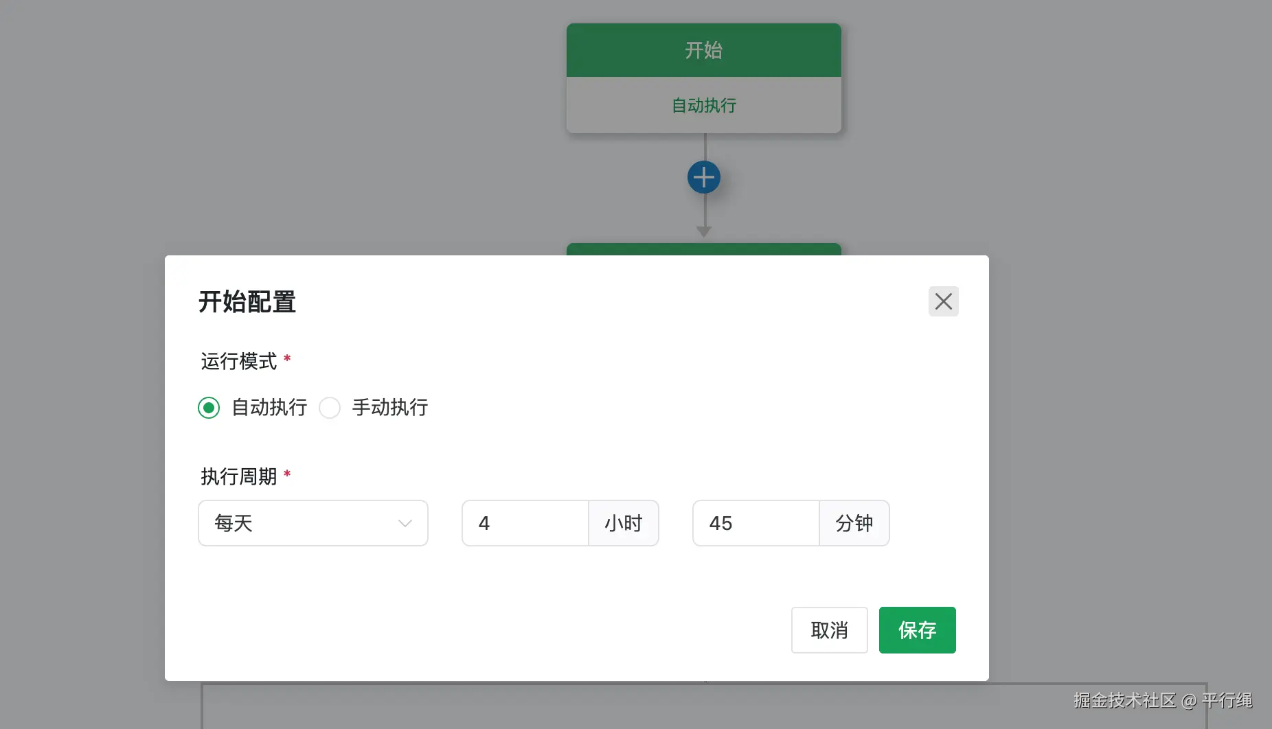 点击开始节点,可以设置工作流什么时候执行,这个根据自己实际情况设置,也可以直接使用默认的。