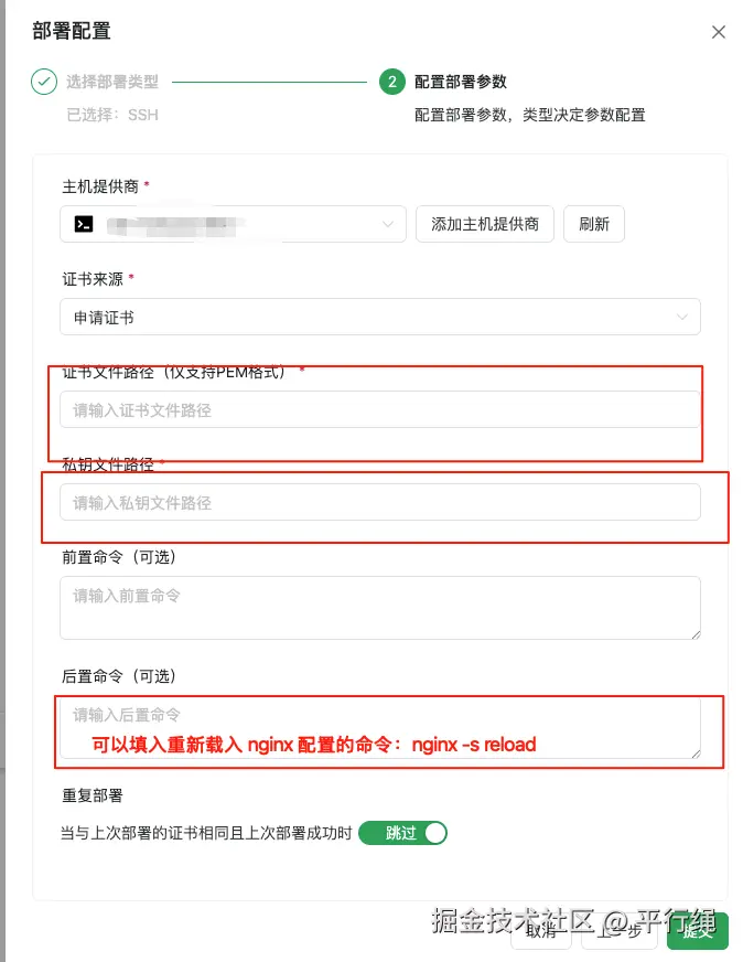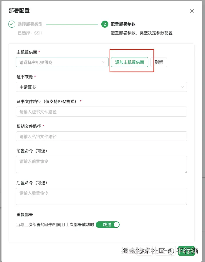 添加需要更新证书的主机地址和登录的用户名密码,再点击确认按钮保存即可。再回到部署配置的弹窗,主机提供商那里就出现了你刚才保存的主机
